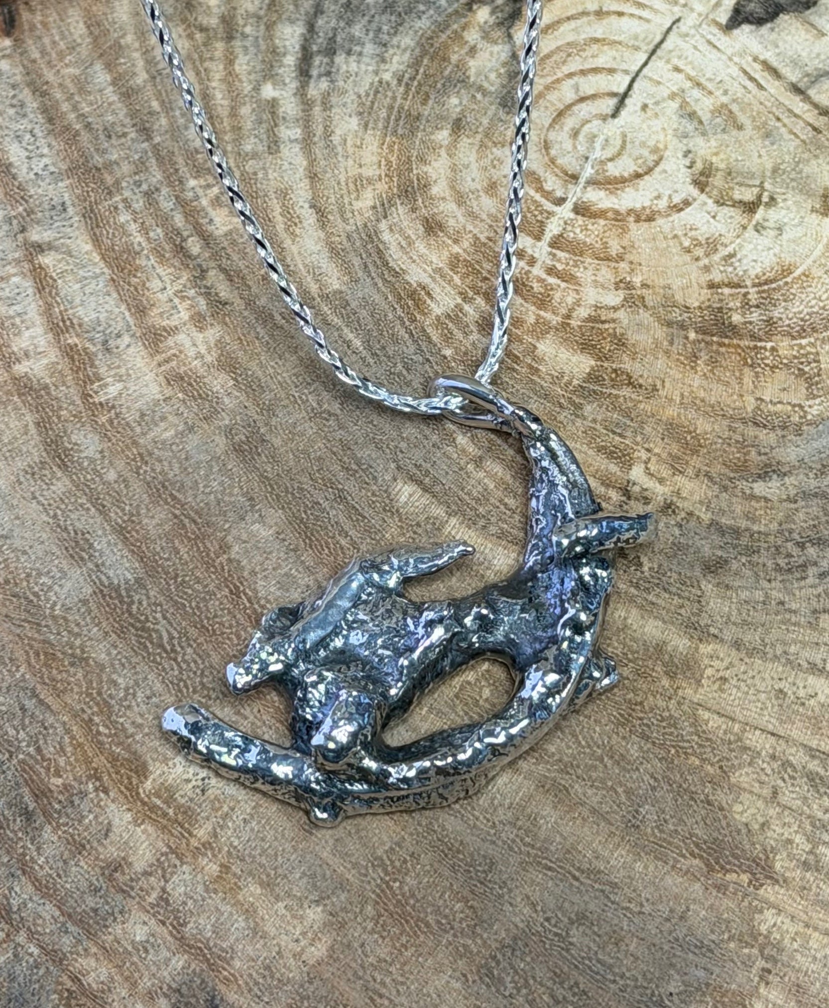 From my Alchemy collection, this captivating large molten pendant reveals an enchanting silhouette-a hare jumping over the moon. Born from the transformative power of fire and silver, this evocative piece captures a moment of quiet magic frozen in precious metal. One of a kind.